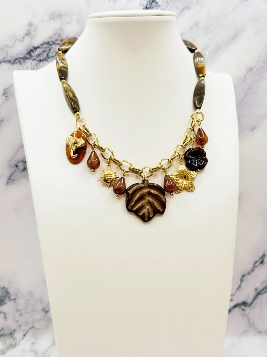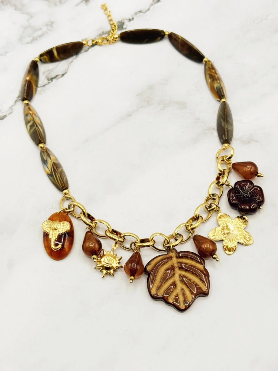 Composta por contas ovais marmorizadas em tons de castanho, esta peça é adornada com uma série de pingentes dourados e caramelo representando elementos da natureza: uma folha tropical, um sol, uma borboleta, um elefante, flores esculpidas...