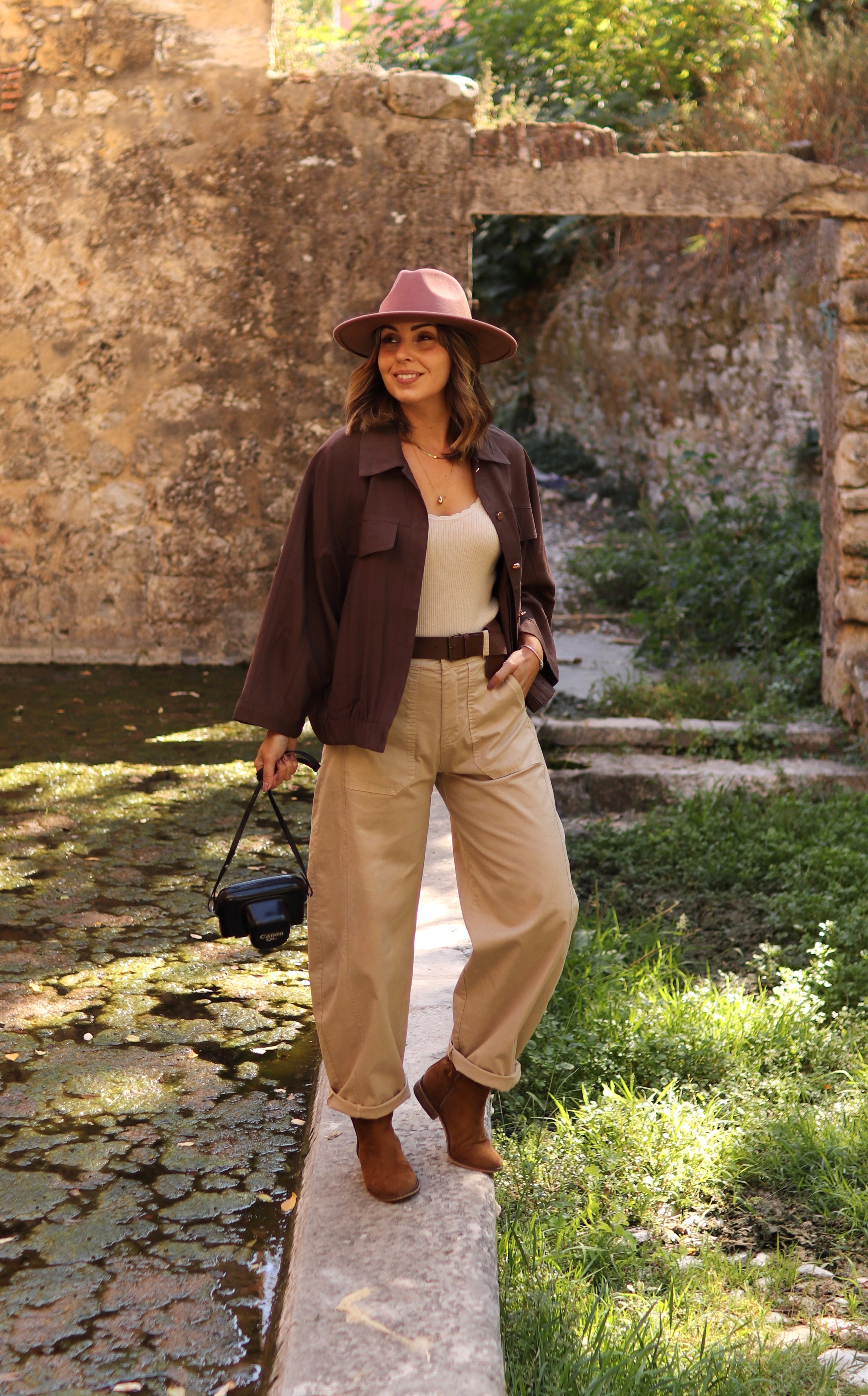 De cintura subida e corte largo nas pernas. Com bolsos à frente. Com cinto (castanho) incluído).