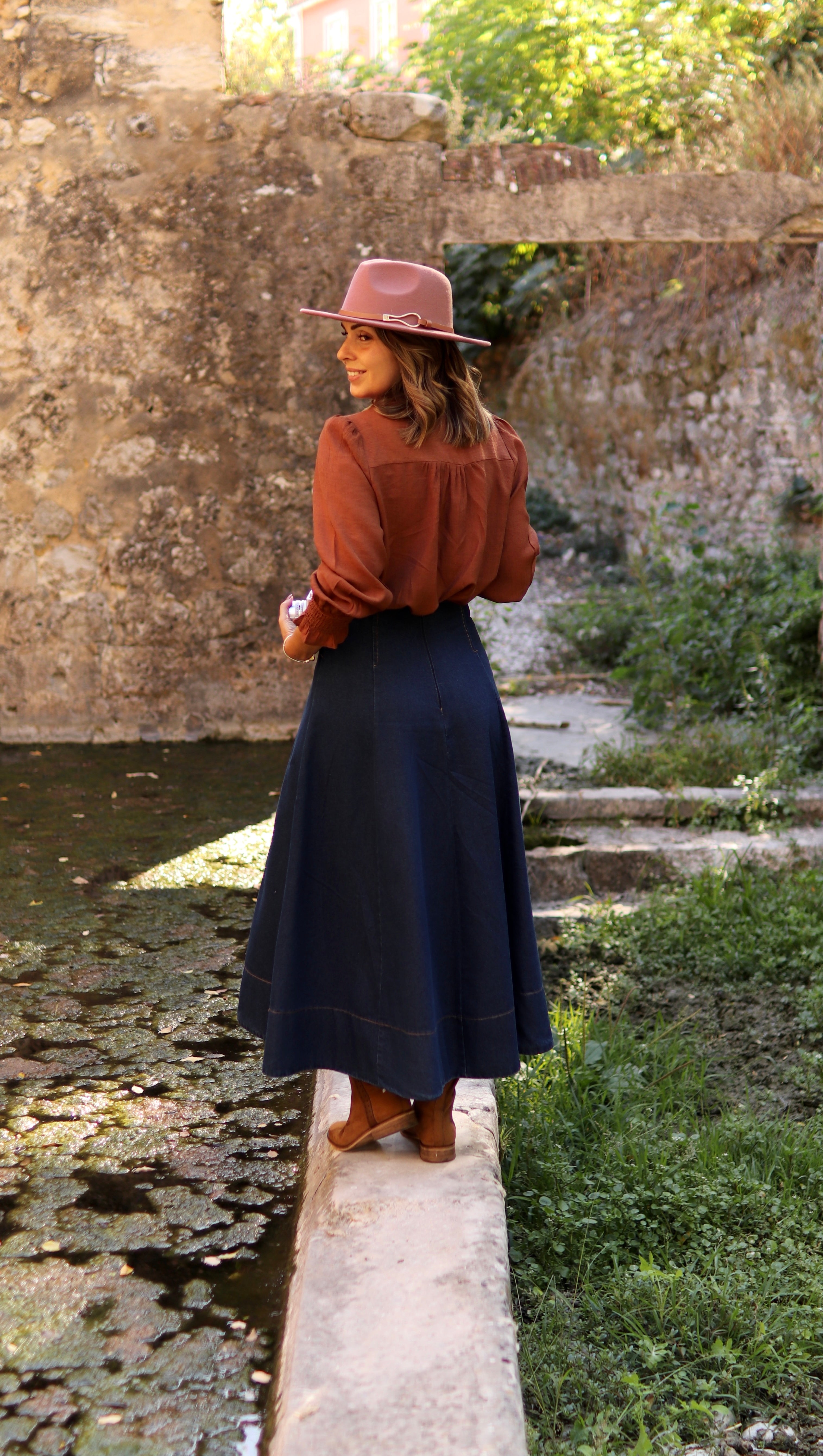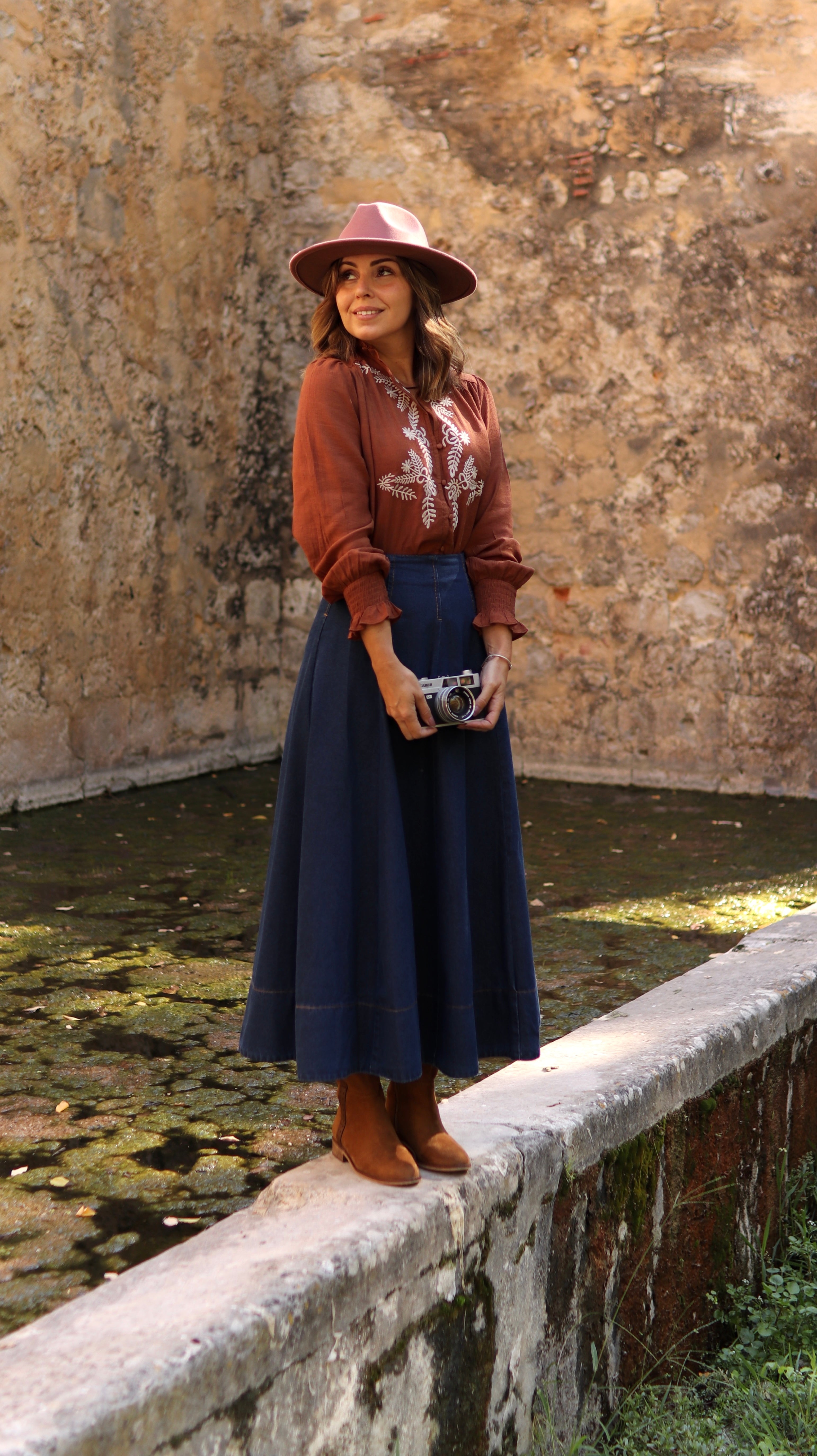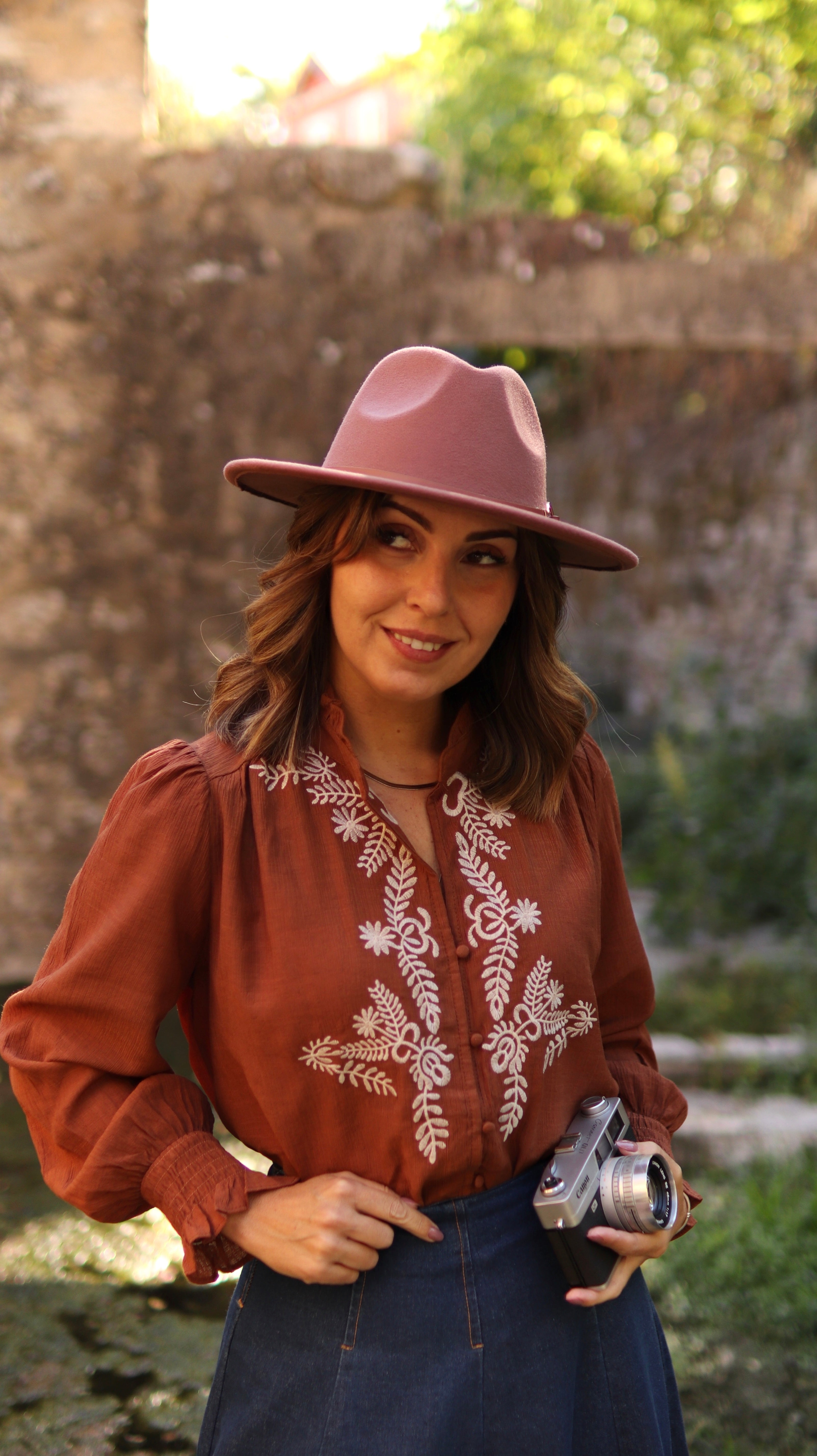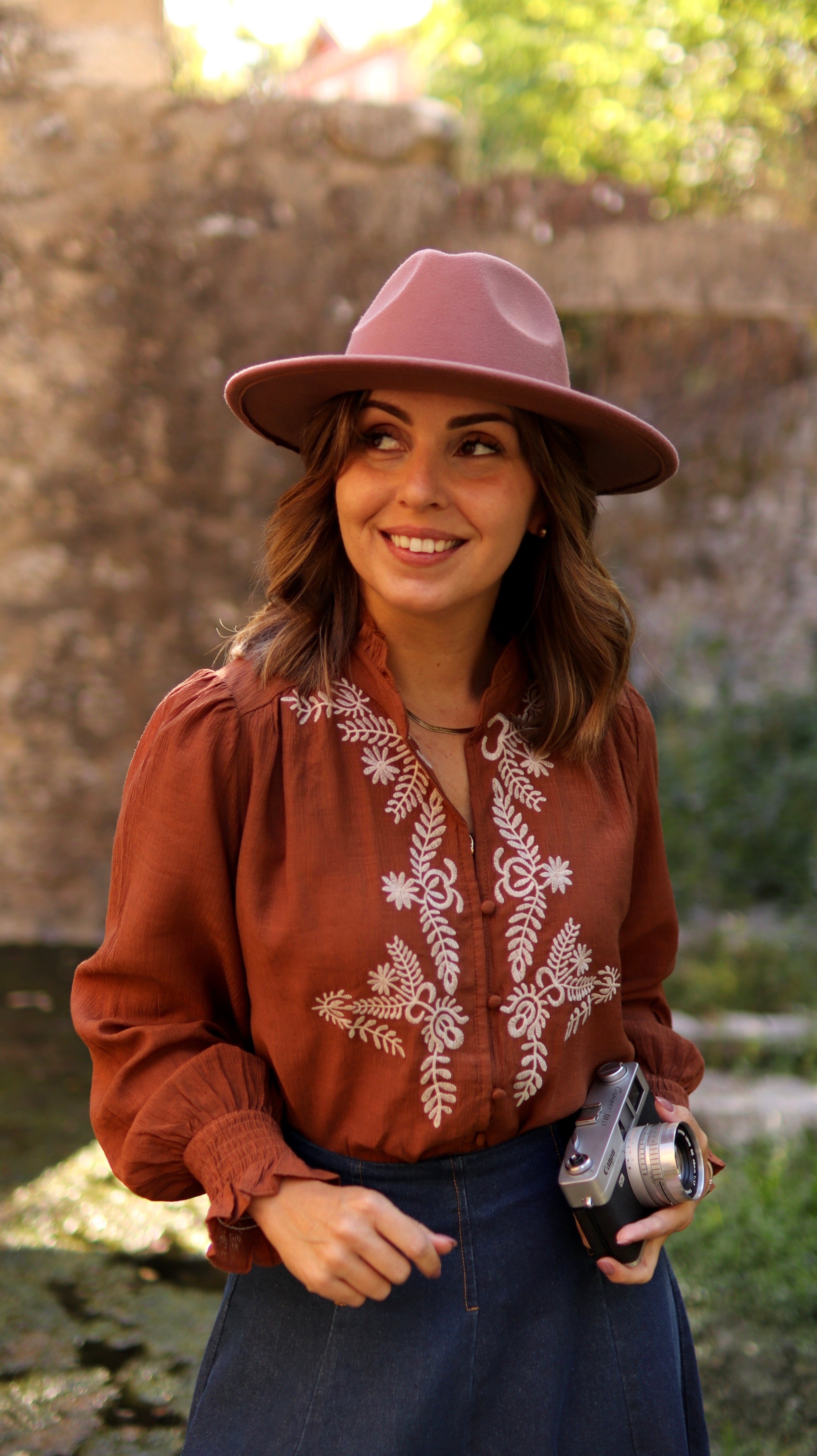 Com o fundo no tom caramelo e os bordados em cru, este camiseiro fica perfeito com qualquer peça em ganga de tom mais escuro e confere-nos um look de outono descontraído, que já os apetece usar.