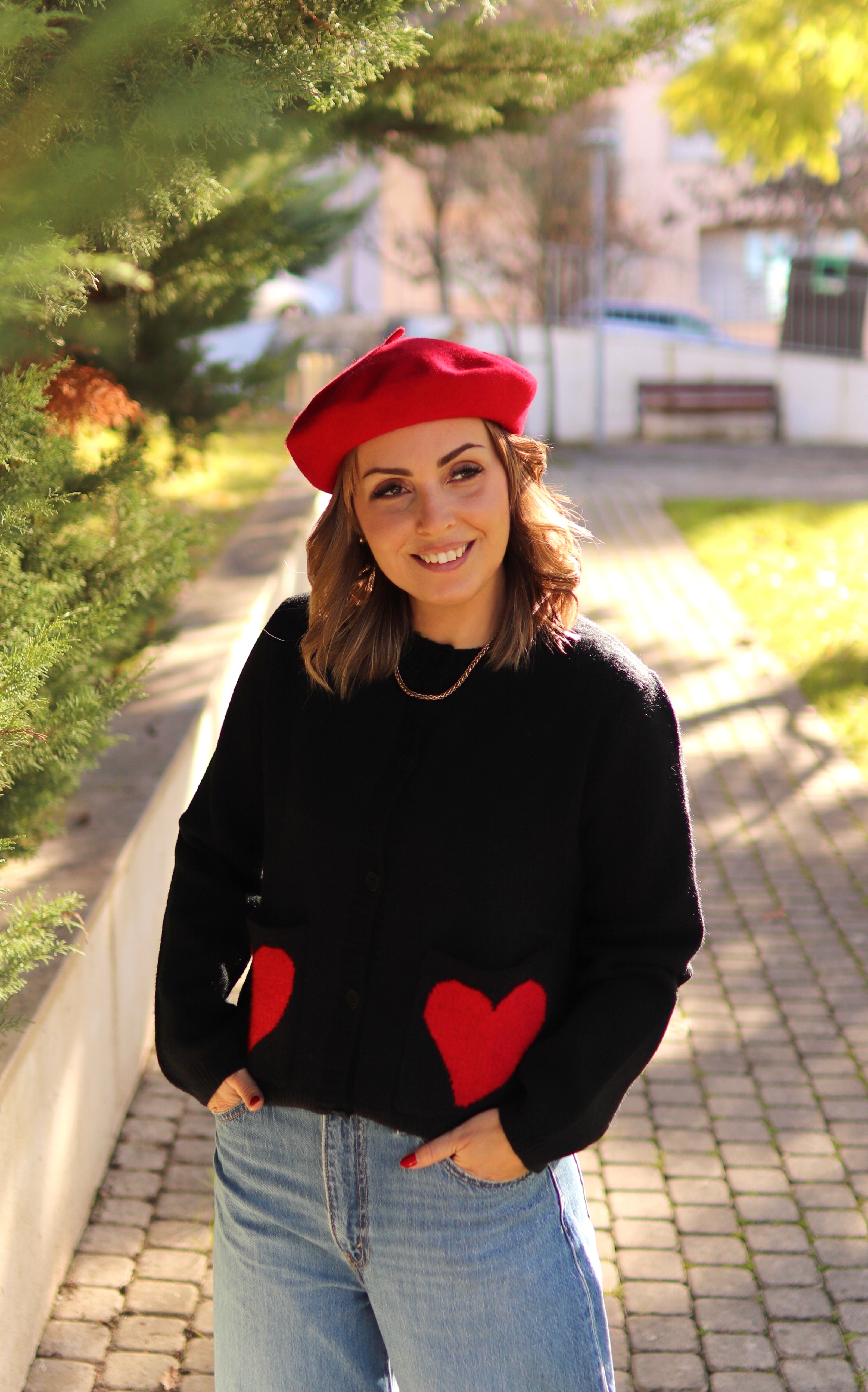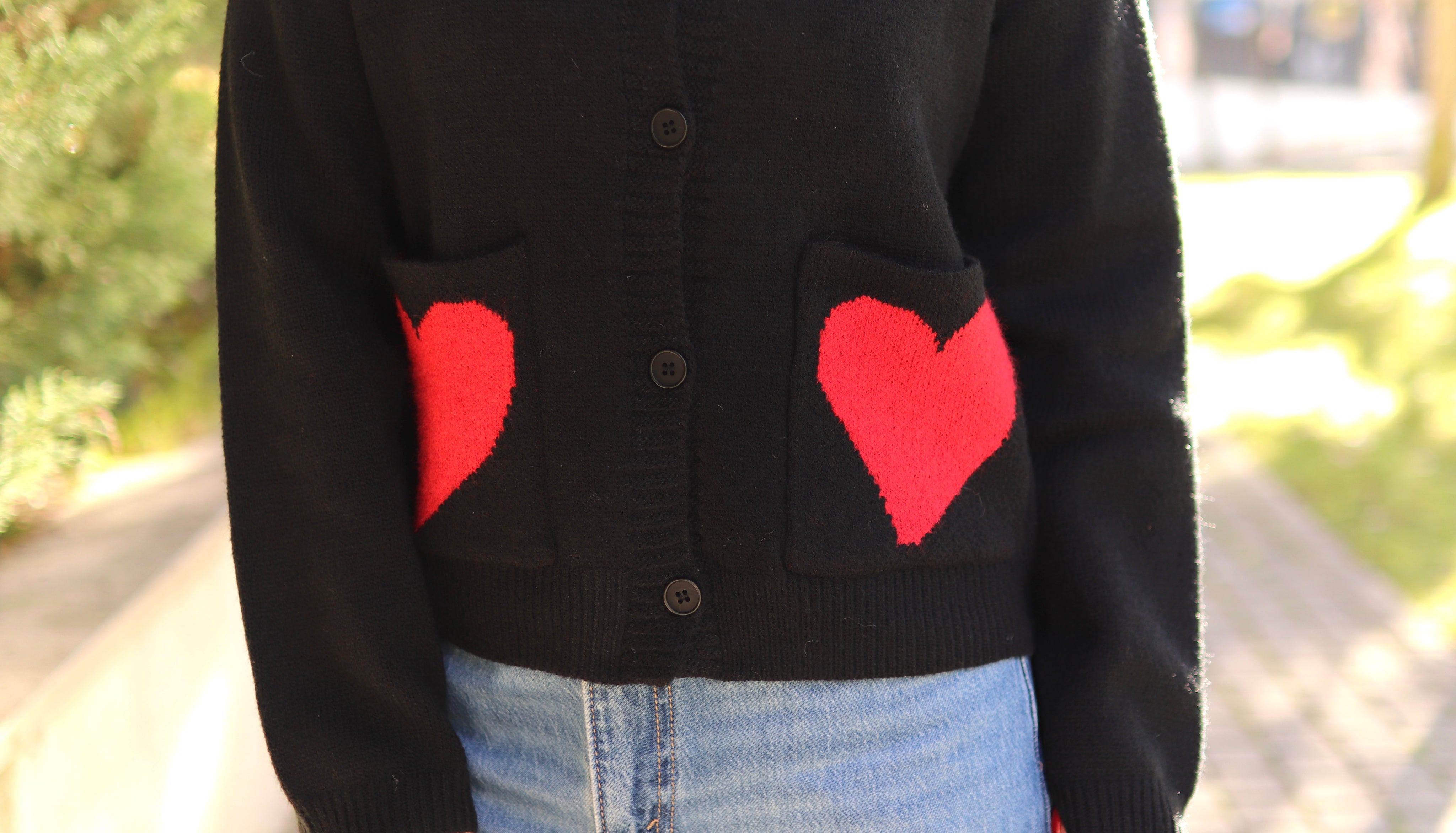 Um peça simples, mas que se diferencia pelos corações vermelhos que tem nos bolsos.