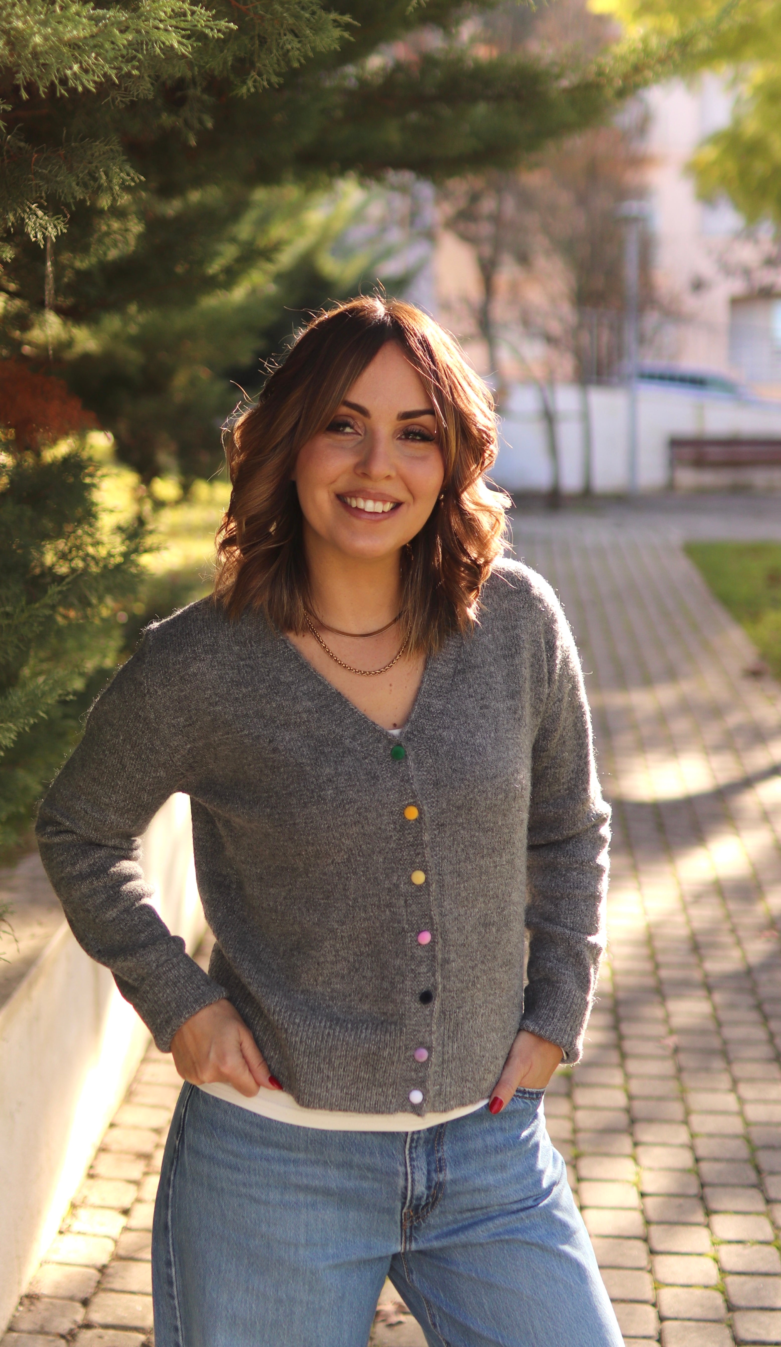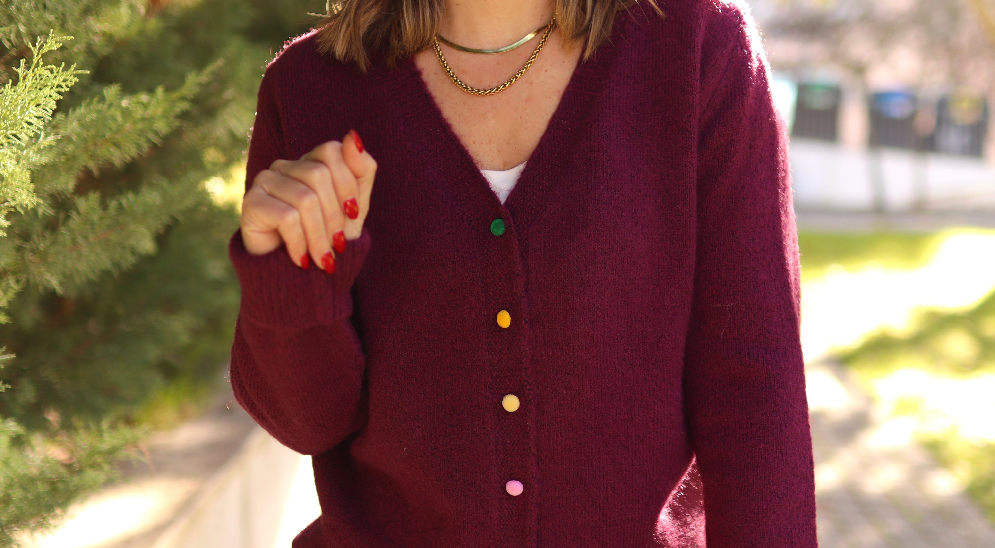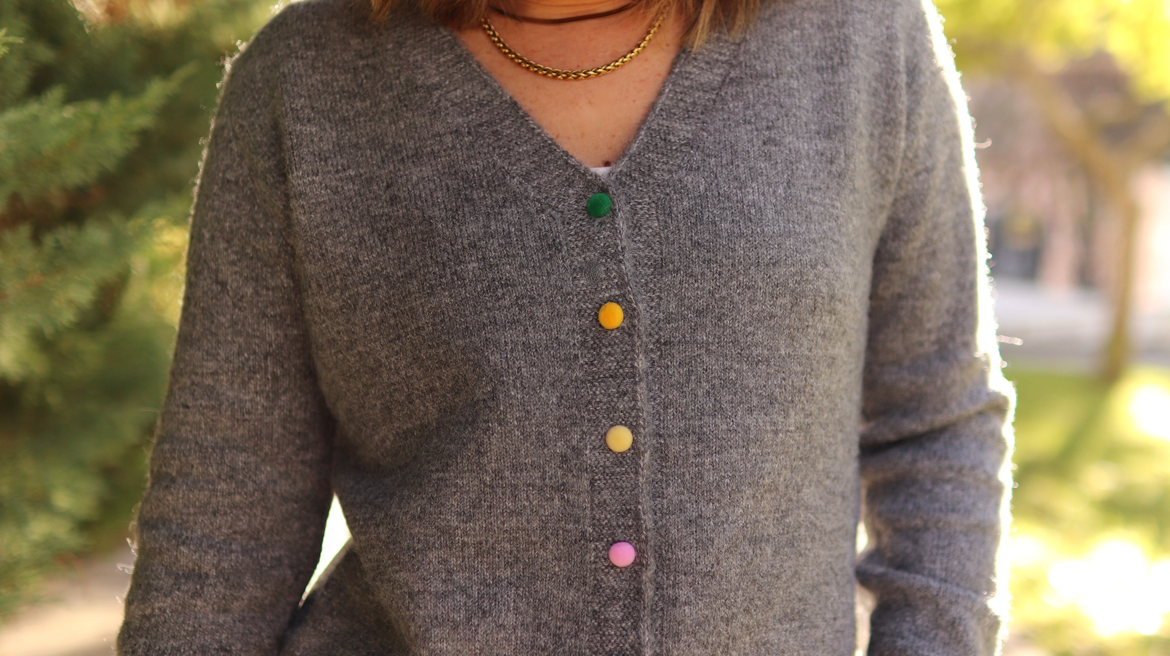 Casaco de malha quente com decote em "V" e botões forrados de várias cores.