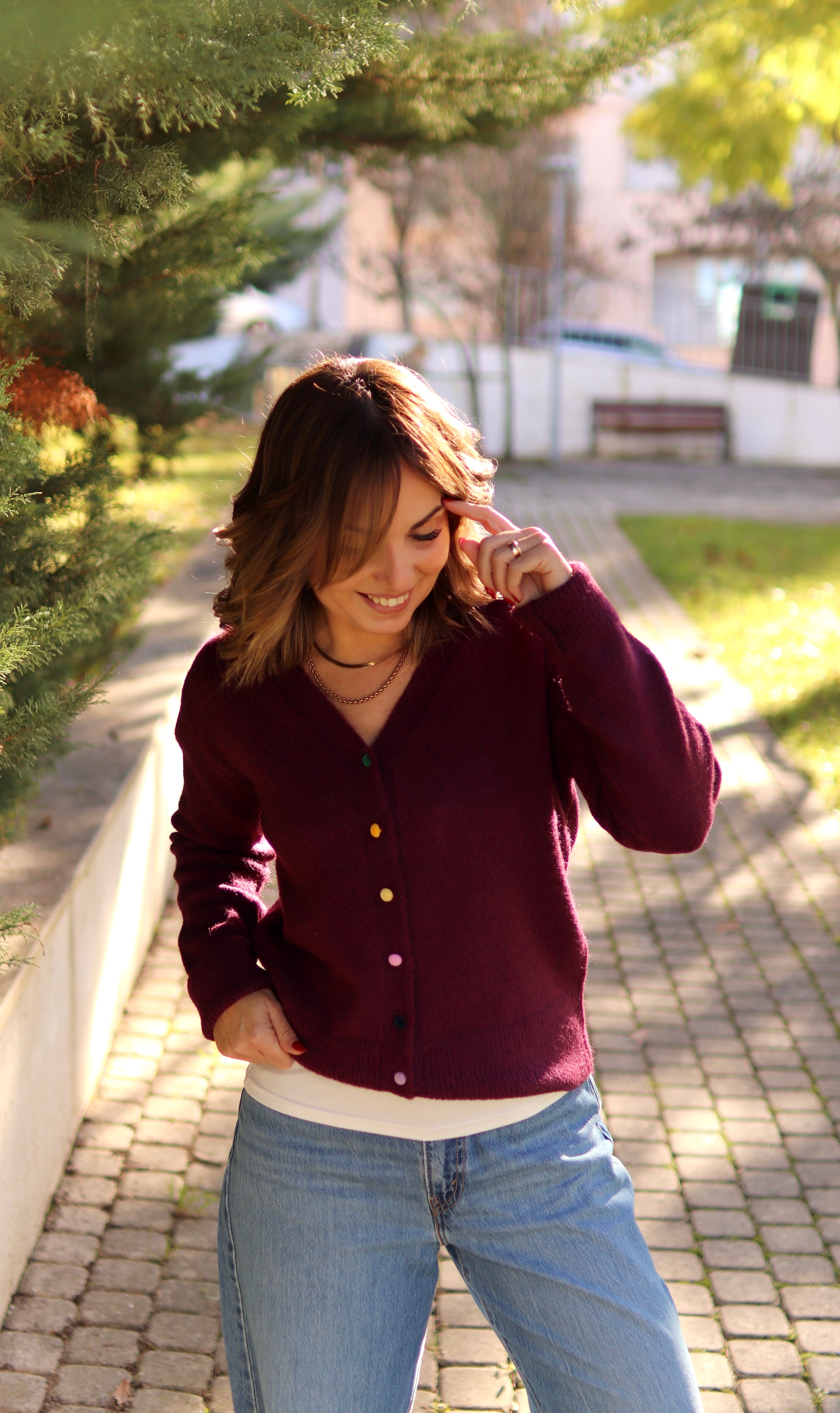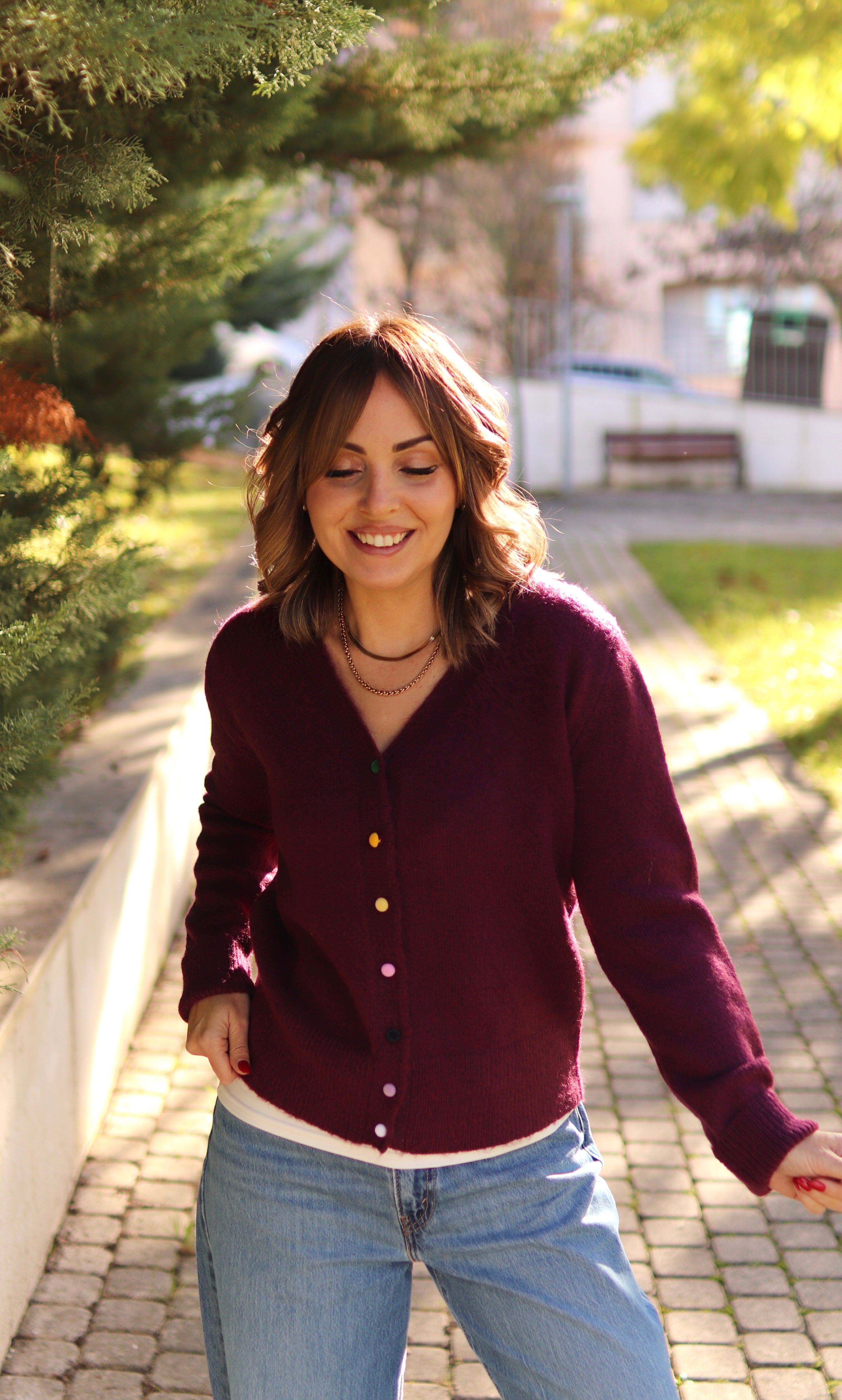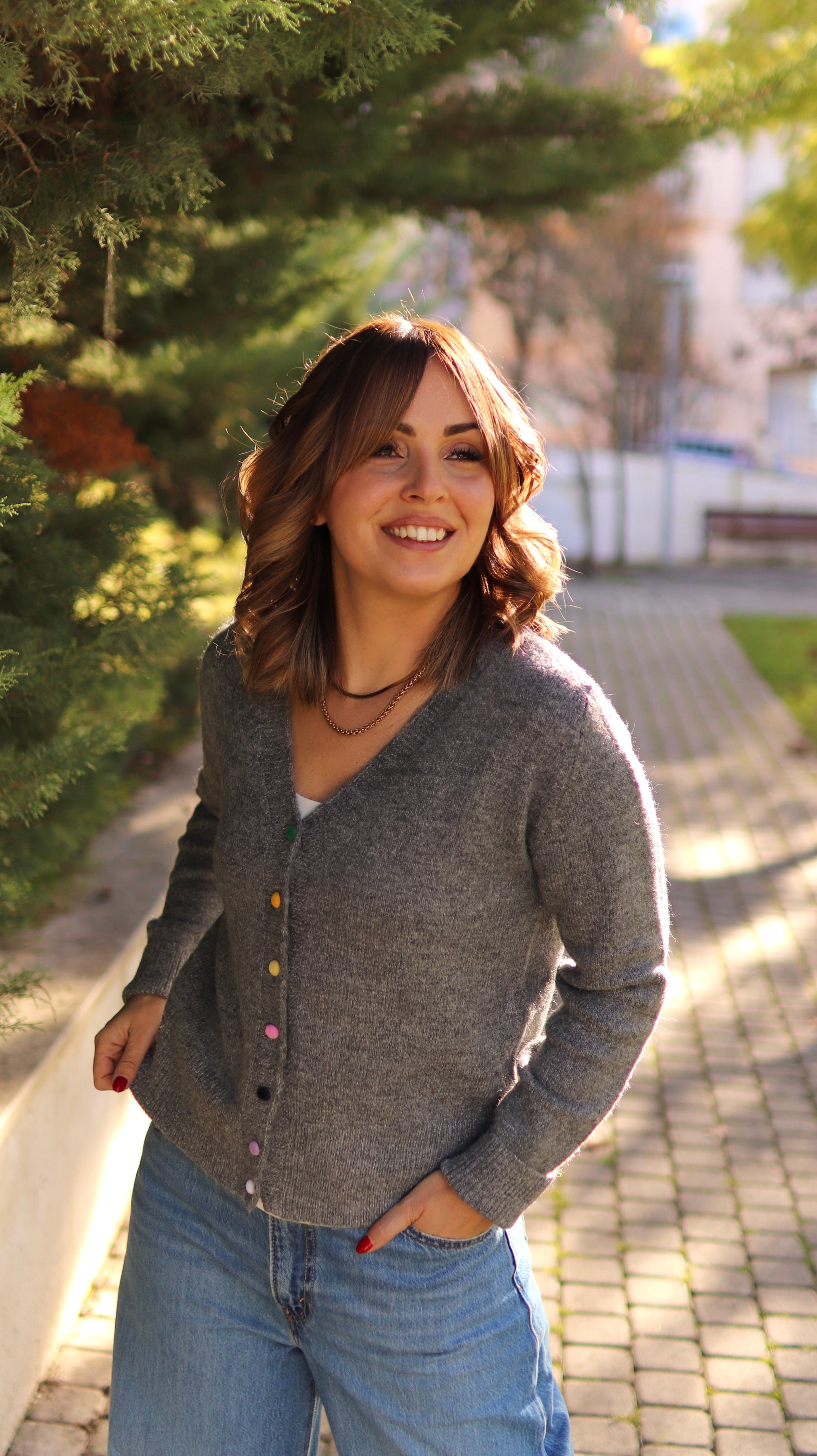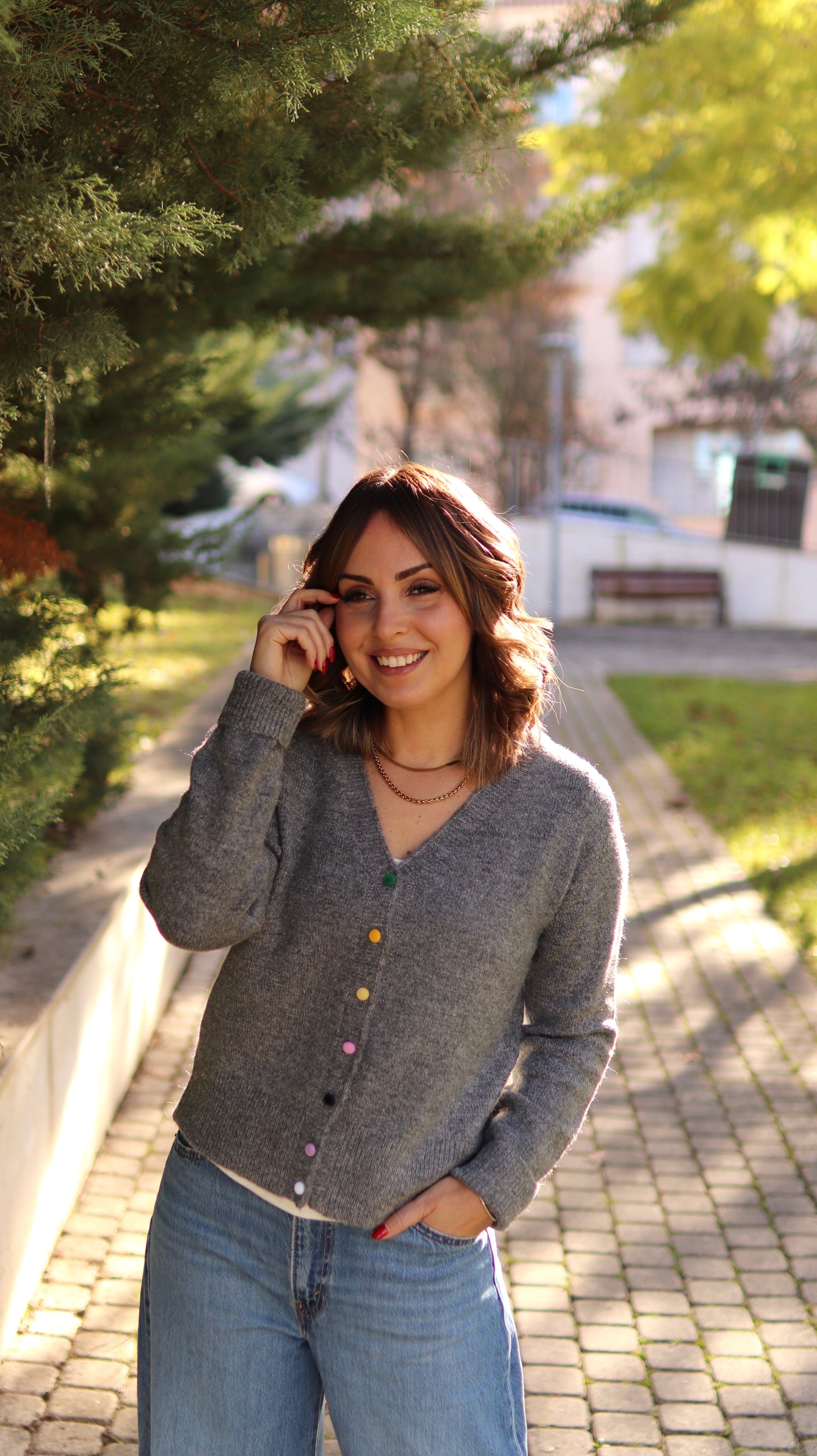 Casaco de malha quente com decote em "V" e botões forrados de várias cores.