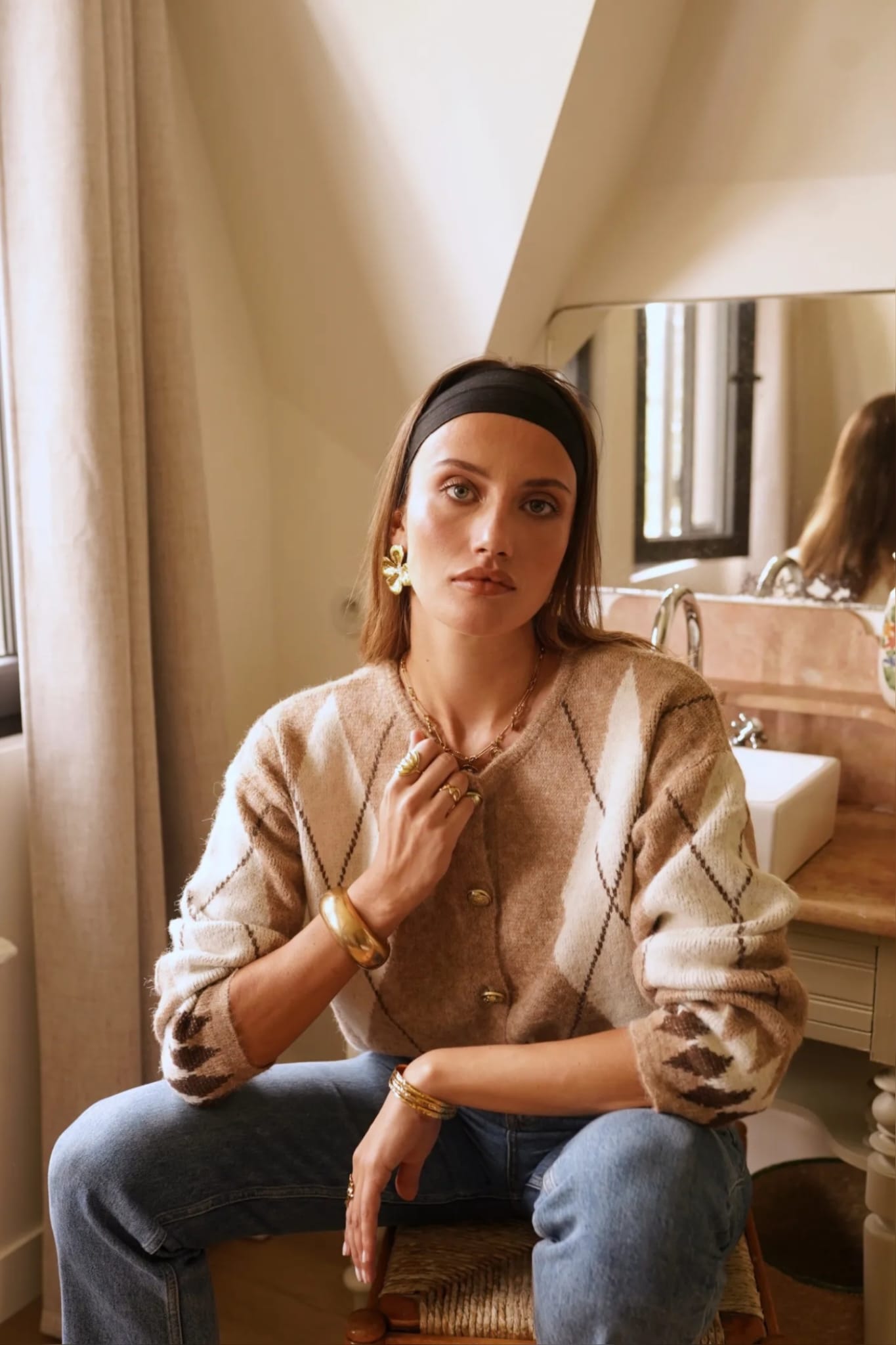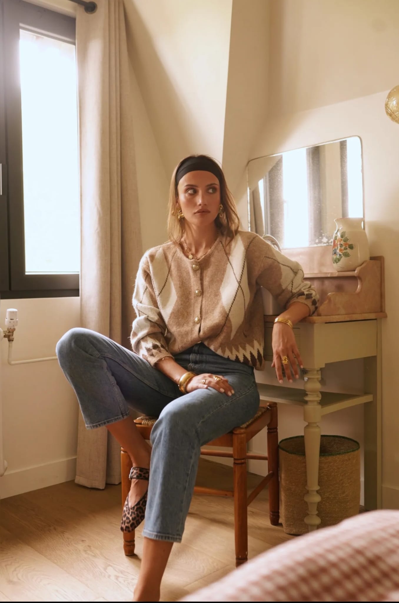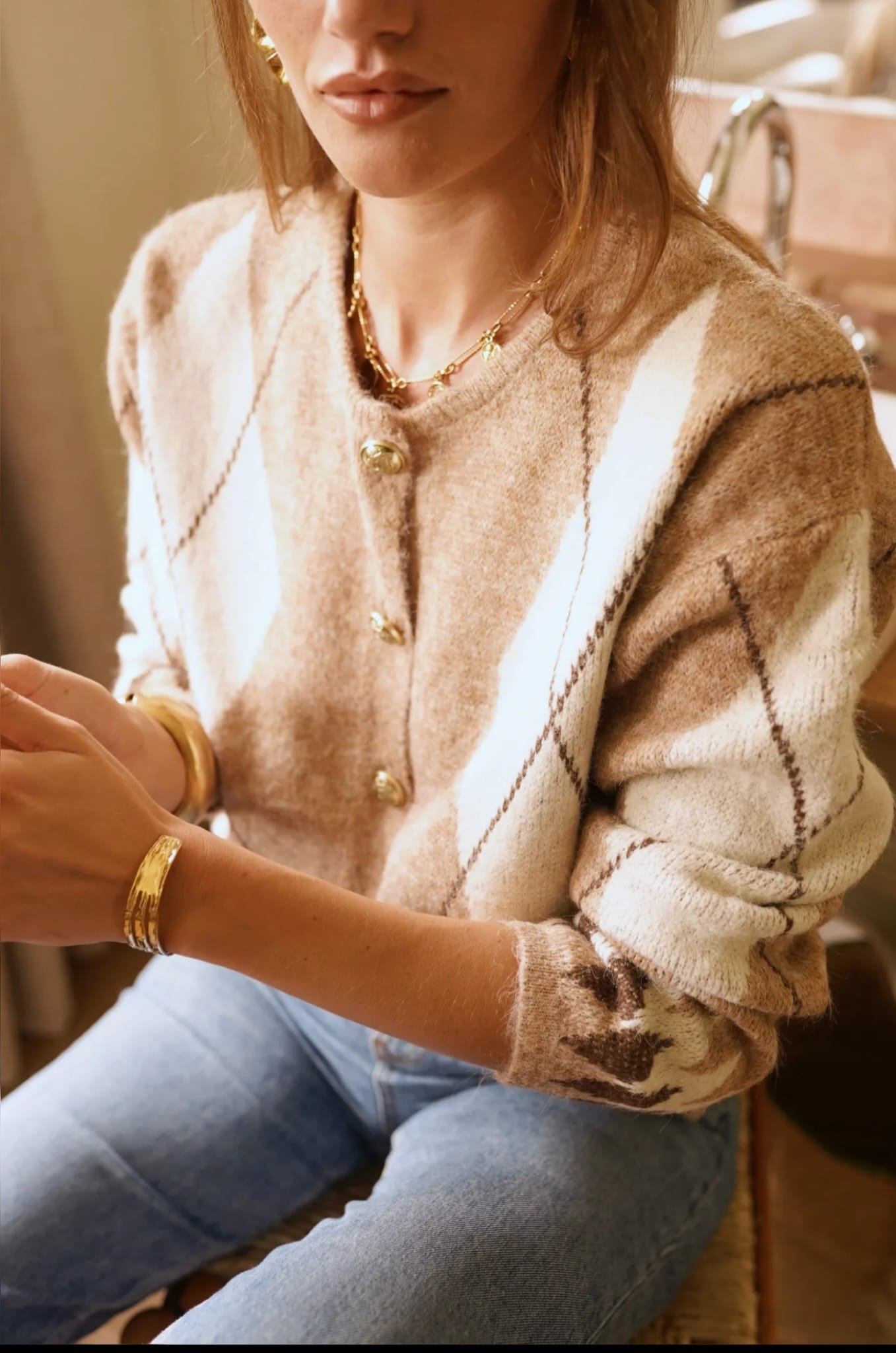 Combinando um estilo moderno aos losangos tradicionais, este casaco de malha muito macia e confortável pode ser usado assim, como camisola ou aberto com um bonito camiseiro branco ou até com uma t-shirt básica.