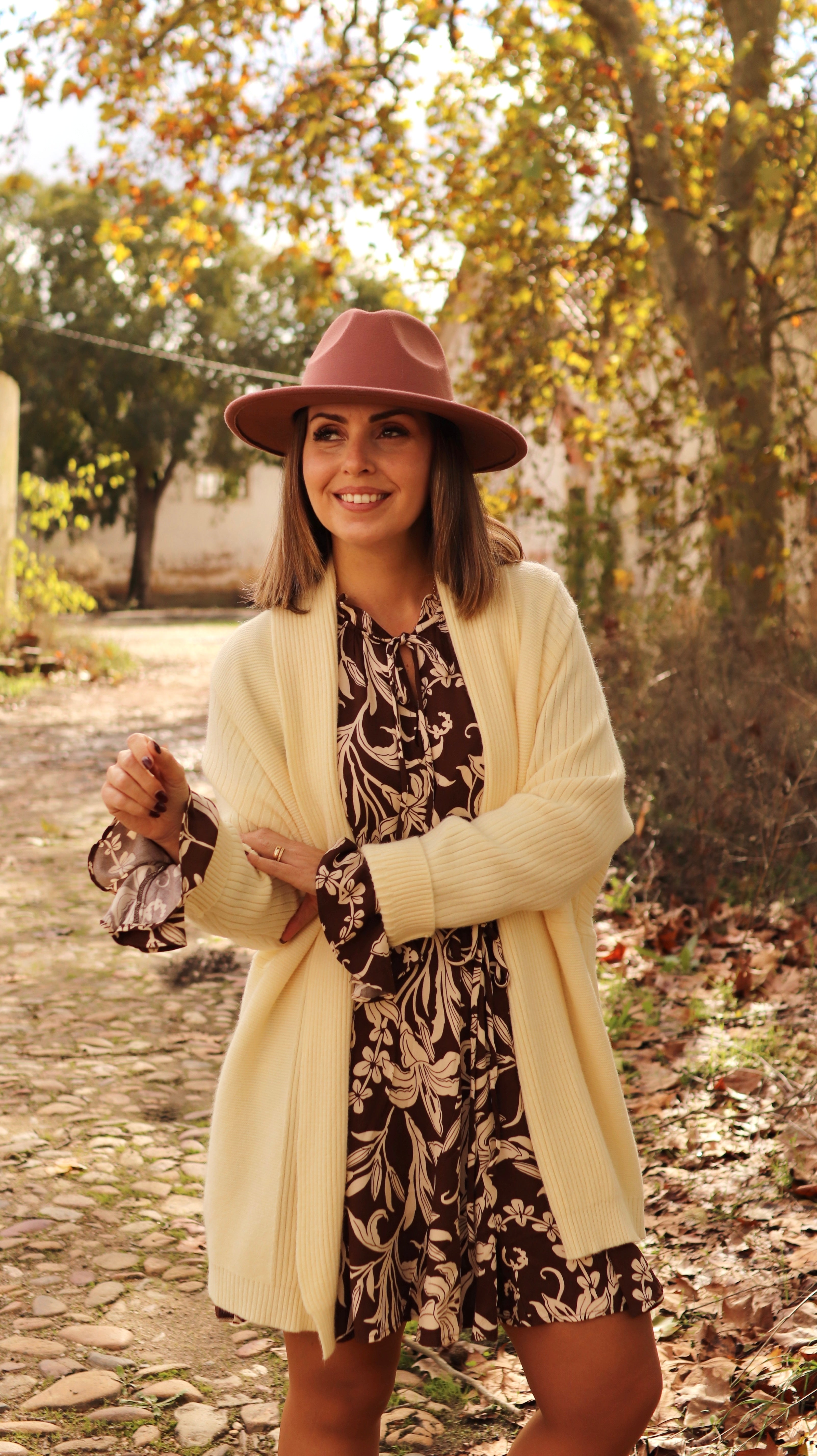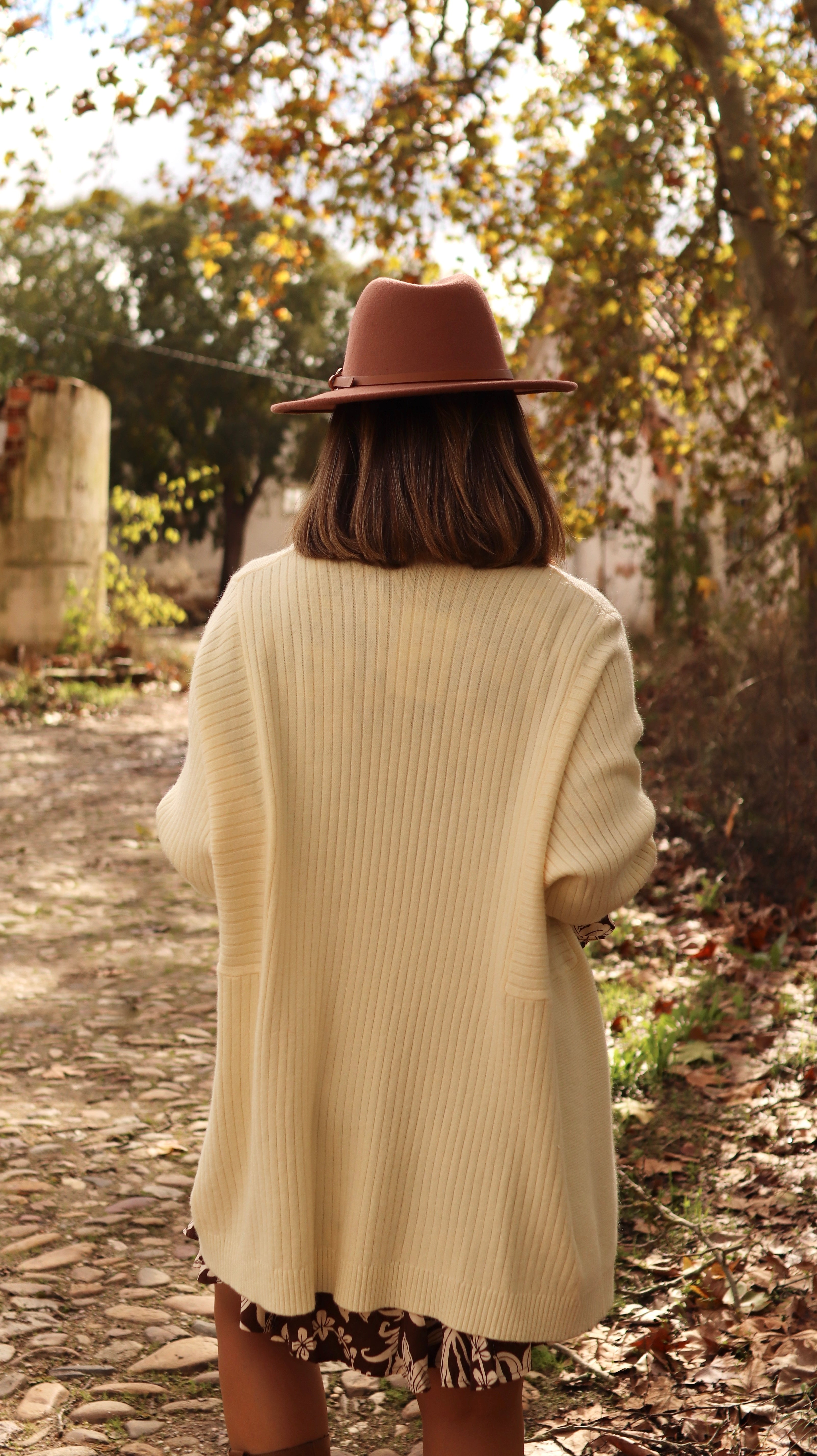 Casaco, de malha mais texturada, tem o corte ideal para combinarmos com vestidos.
