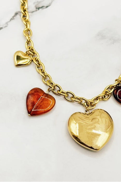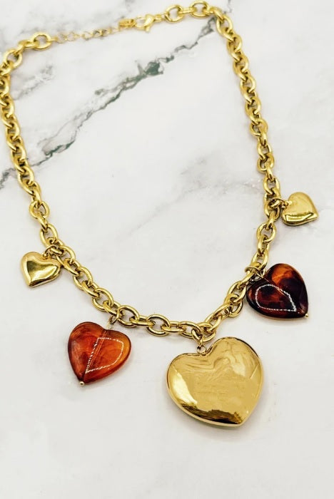 Este colar refinado combina elegância e originalidade graças à sua corrente de aço inoxidável banhada a ouro, adornada com cinco pingentes em forma de coração. Os corações lisos e brilhantes se misturam com corações com detalhes em âmbar, criando um toque acolhedor e atemporal.