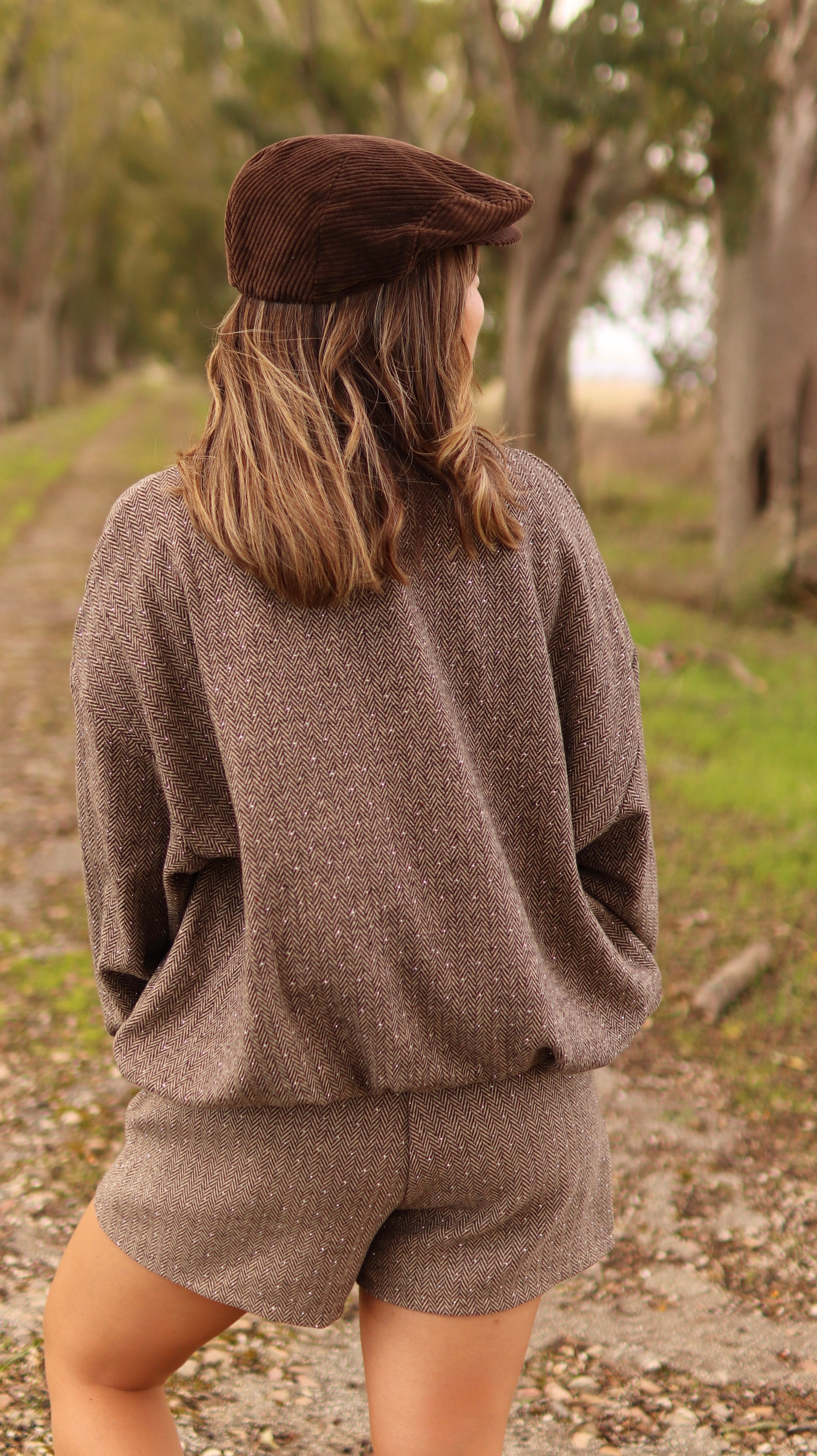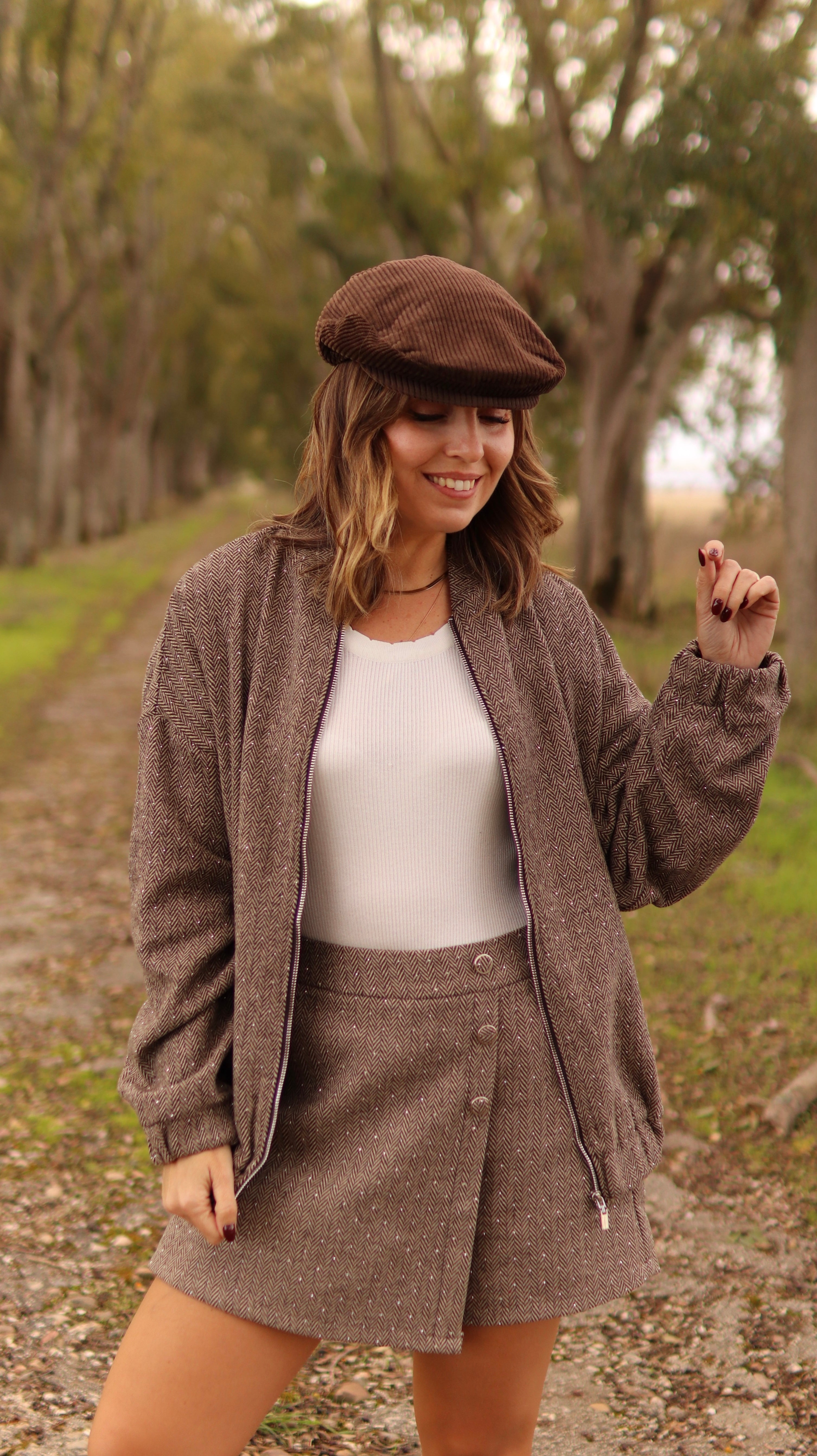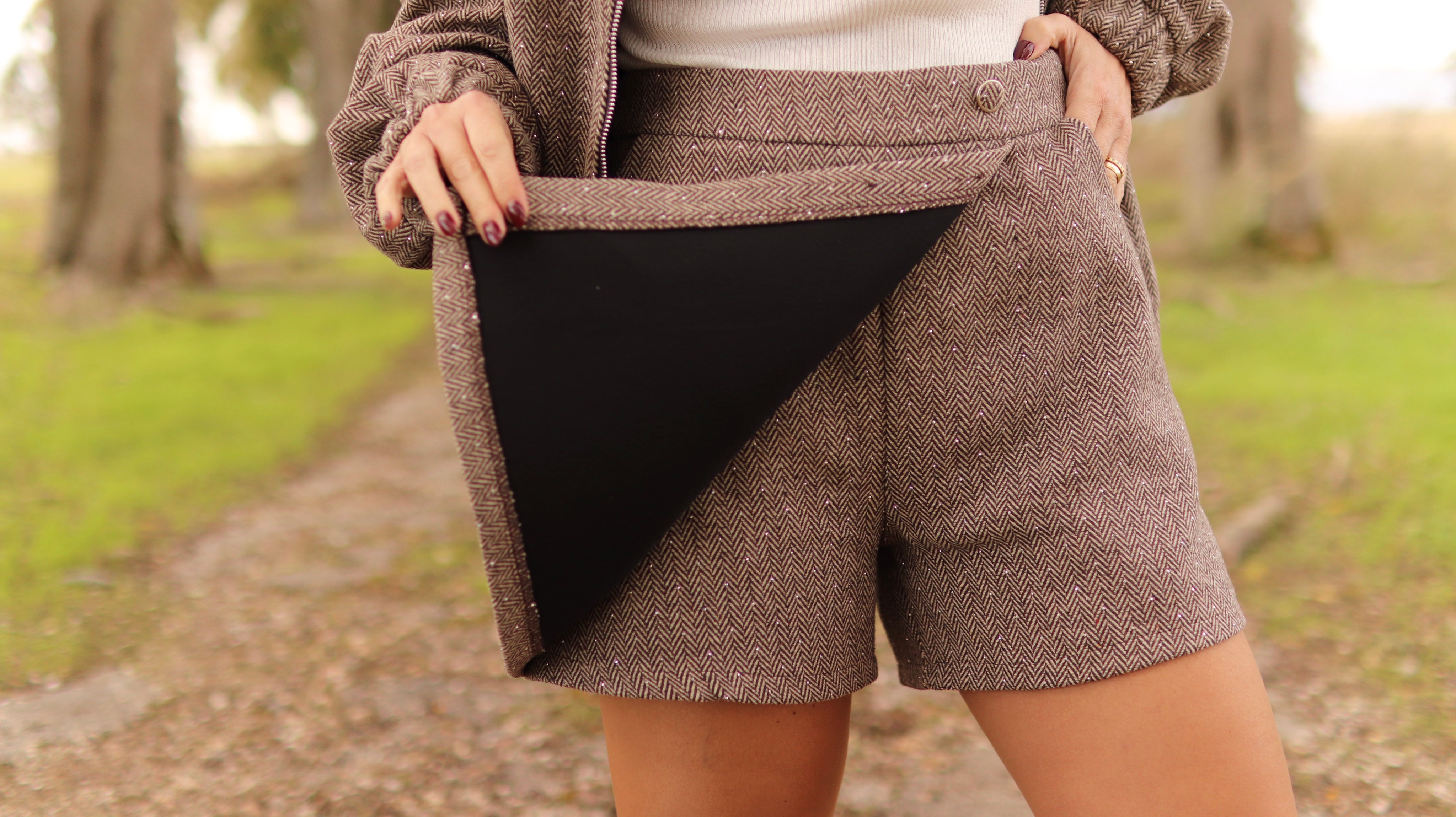 Saia/calção em tecido de fazenda "espinhado" com aplicação de pequenos brilhantes.