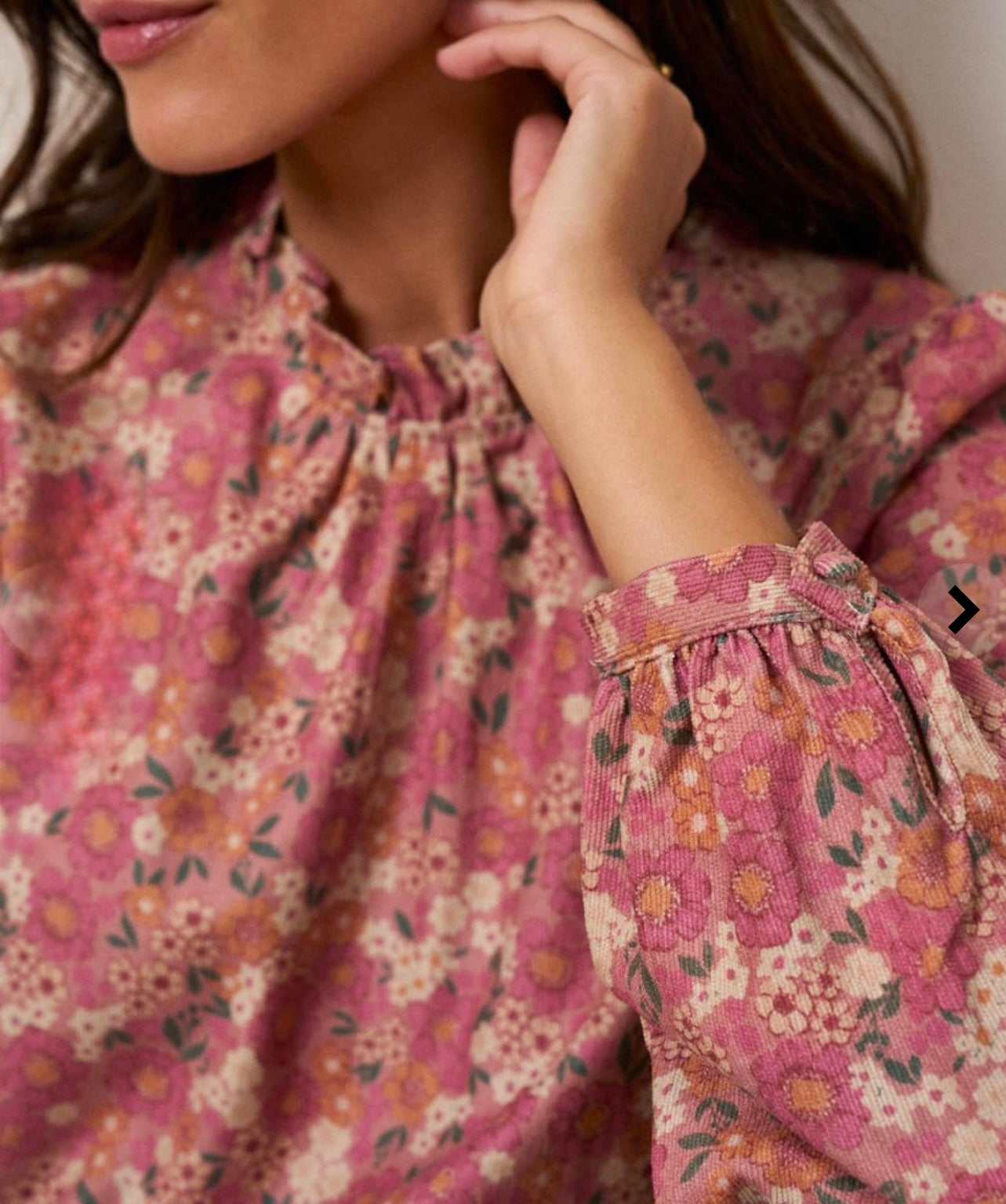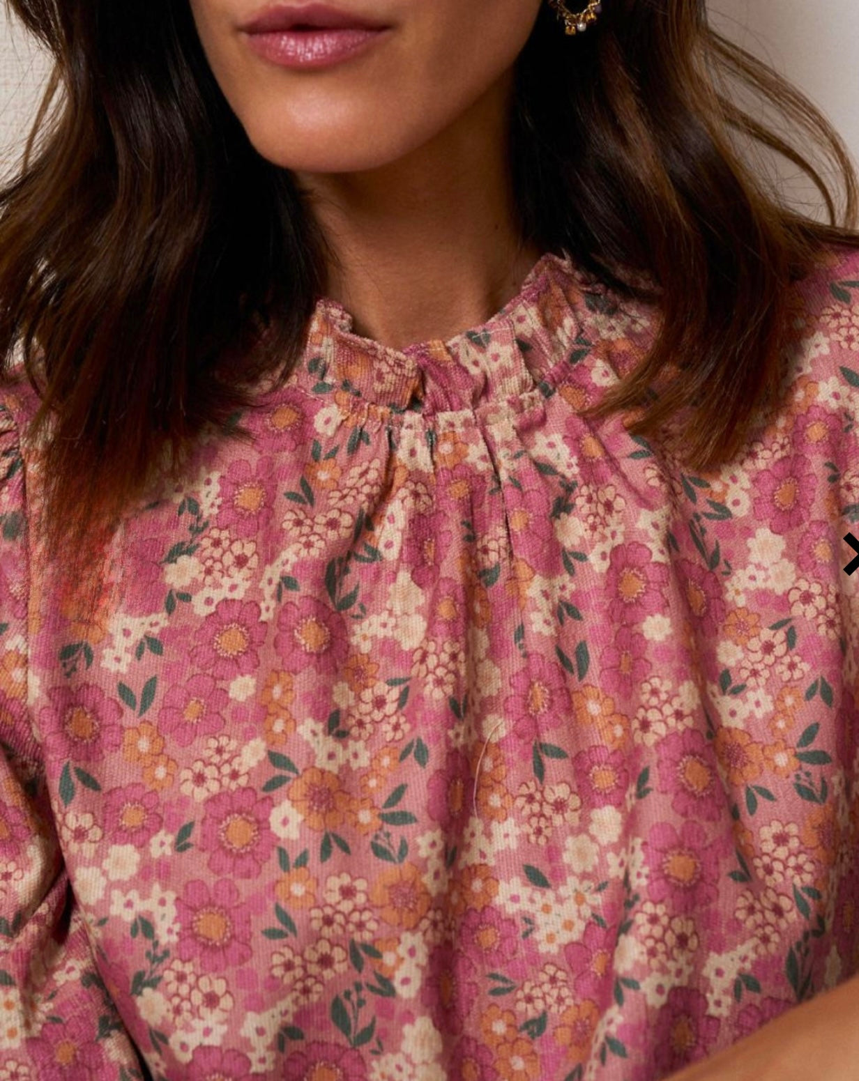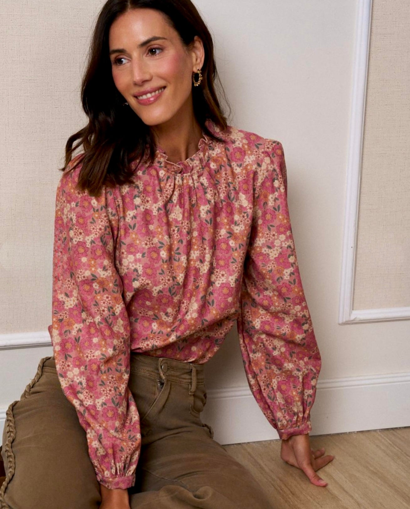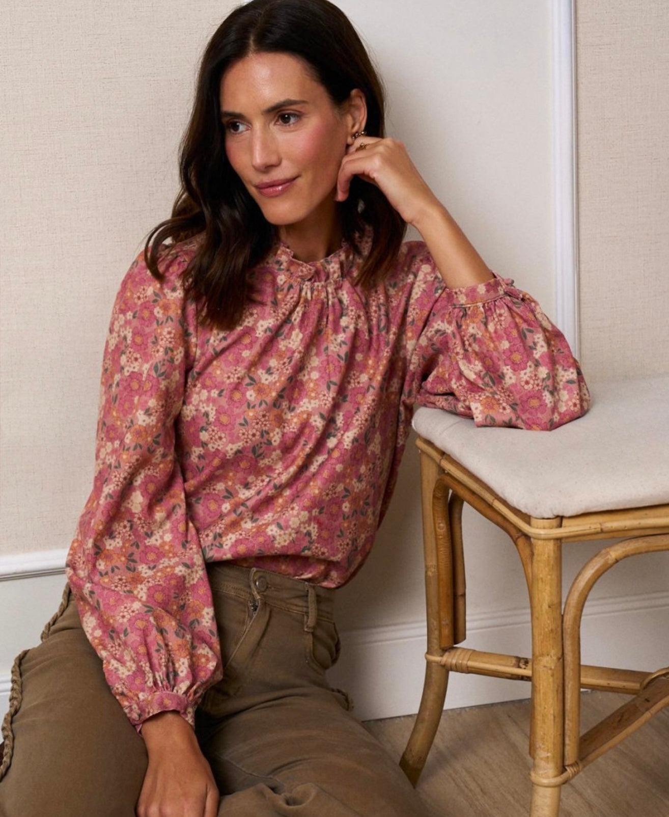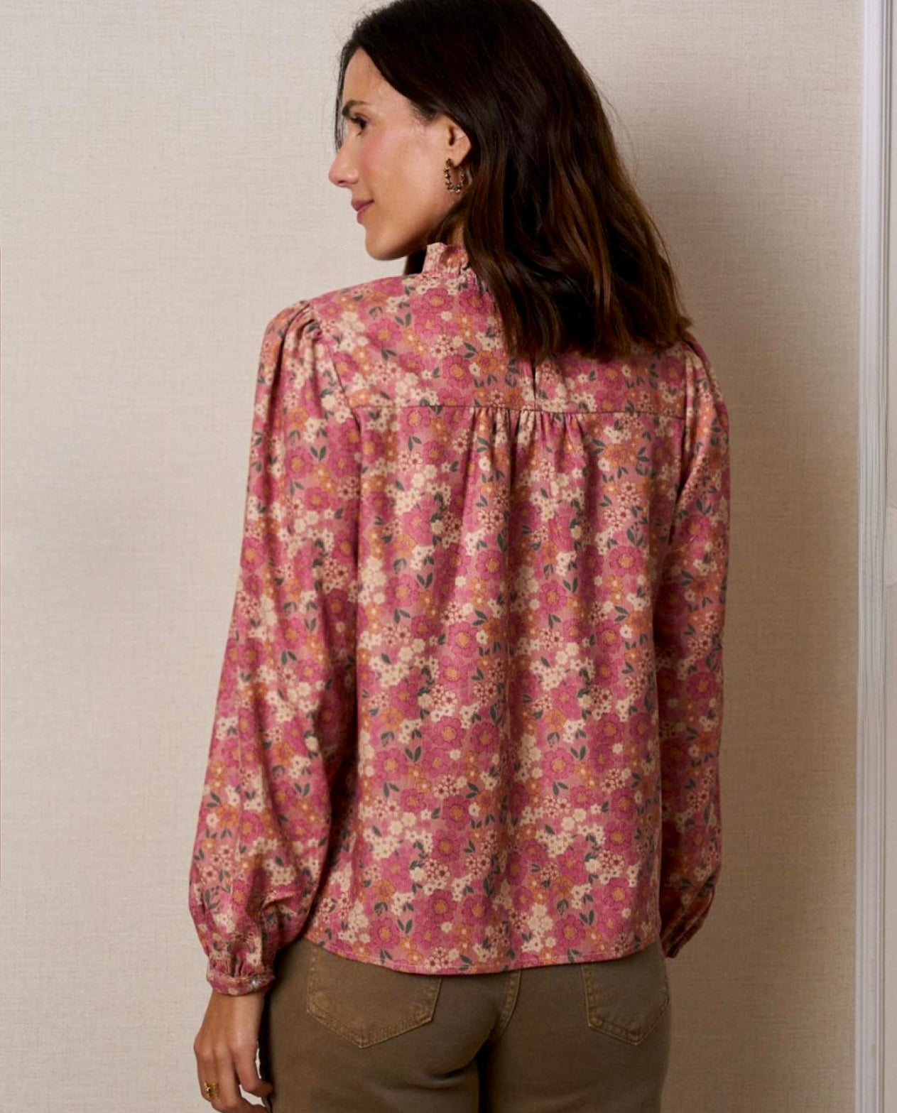Túnica em bombazina fina com aplicação de folho na gola e mangas ligeiramente em balão.