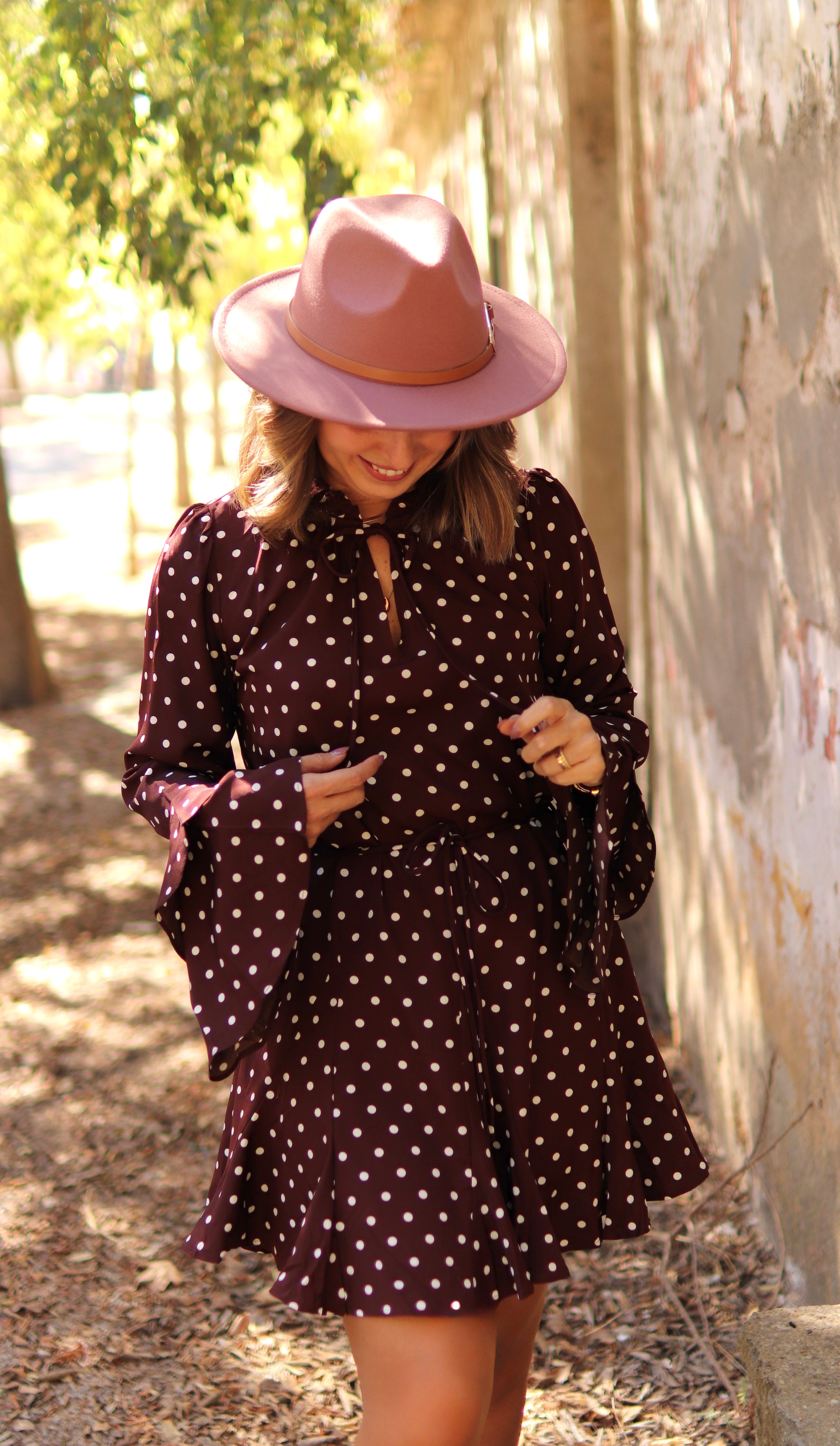 Com um tecido leve e com bastante movimento, este vestido alia três das caraterísticas que mais gostamos…, a cor "chocolate" (a tendência da coleção), padrão de bolinhas (sempre irresistível) e um corte perfeito.